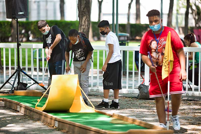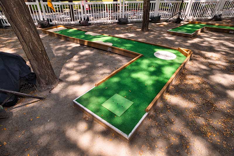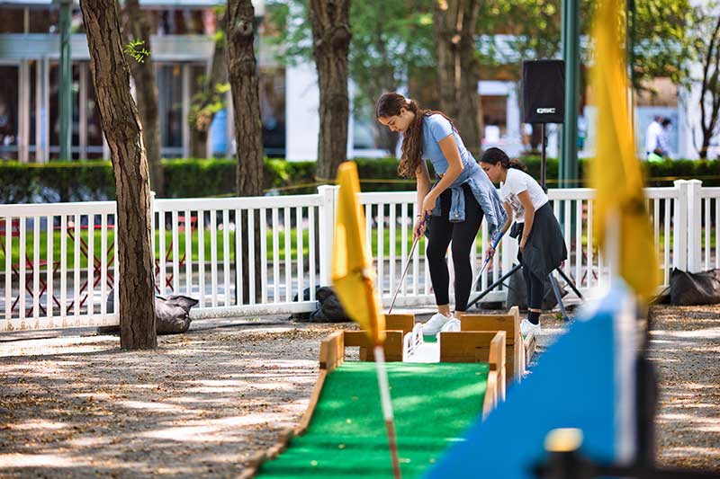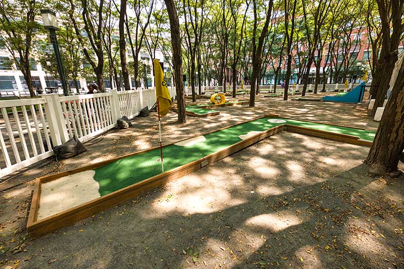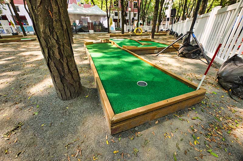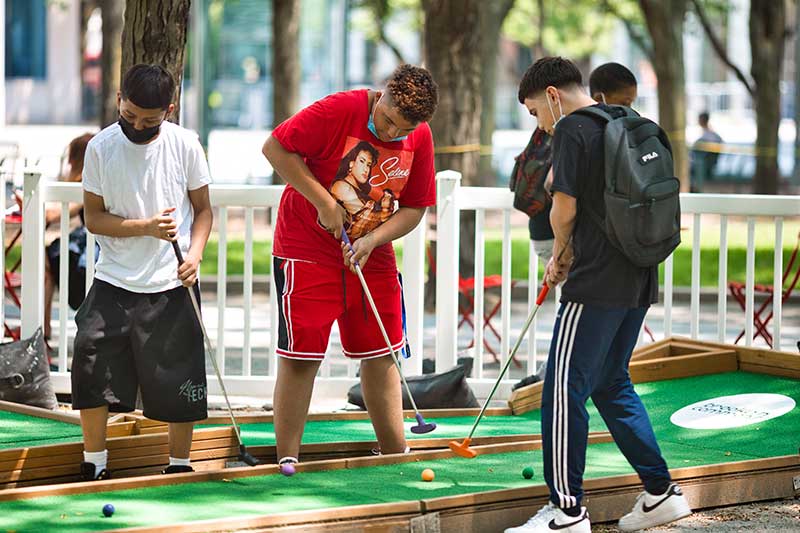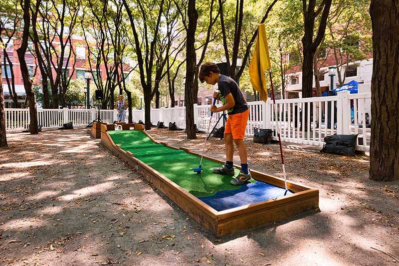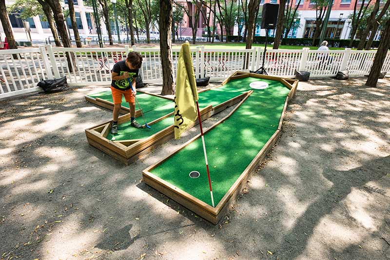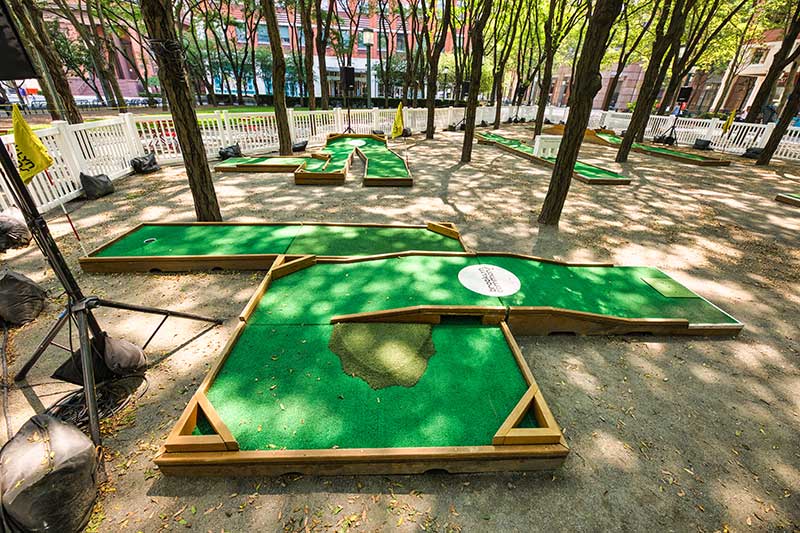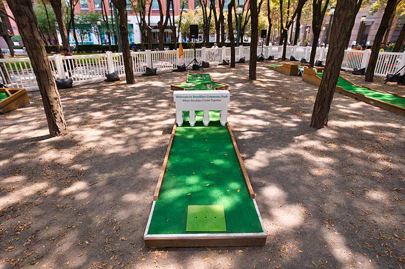With the success of the long term mini golf installation at Brookfield Place, we were asked to create a 7 hole mini golf rental at Brookfield Properties location in Brooklyn, New York. Previously known as Metrotech, this 16 acre location is comprised of 12 office buildings centered around a common park/plaza area. Since its creation in the 1980's, the common park & outdoor plaza area has become a popular pass through area not just for the individuals working in the 12 office buildings but also for the residents in the nearby growing neighborhood.