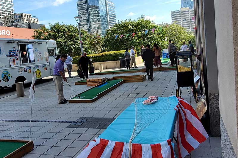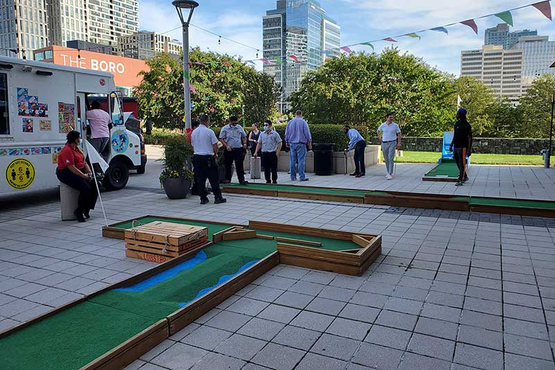 As late morning approached, individuals from their respective offices starting trickling down to the outdoor plaza area. Never before had such an attraction been available to them and they were extremely appreciative that it was being offered as an entertaining break from being in the office during a pandemic. With holes placed more than 6 feet apart as well as having our Mini Golf Sanitistation on site to sanitize the golf clubs and golf balls, mini golf players were comfortable and confident with the health and safety protocols that were in place. The course remained busy & crowded during the lunch hours and had fewer players between the hours of 2:00 PM-4:00 PM. It then had a final rush of activity between 4:15 to the course closing as employees were on the way home but choose to stay around to play a round of mini golf with their colleagues.