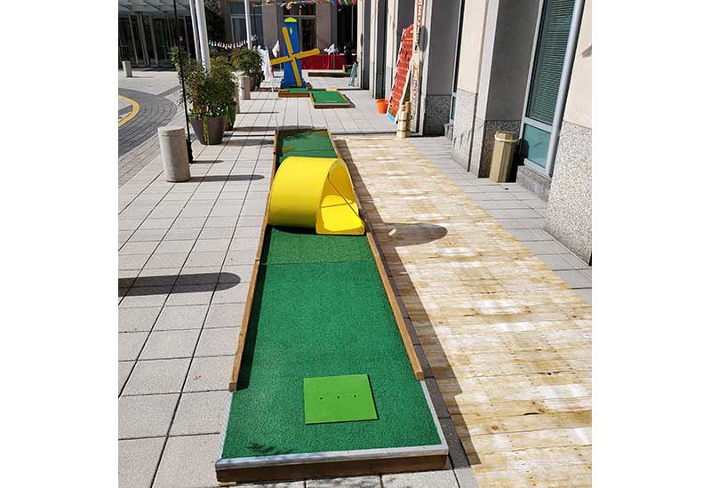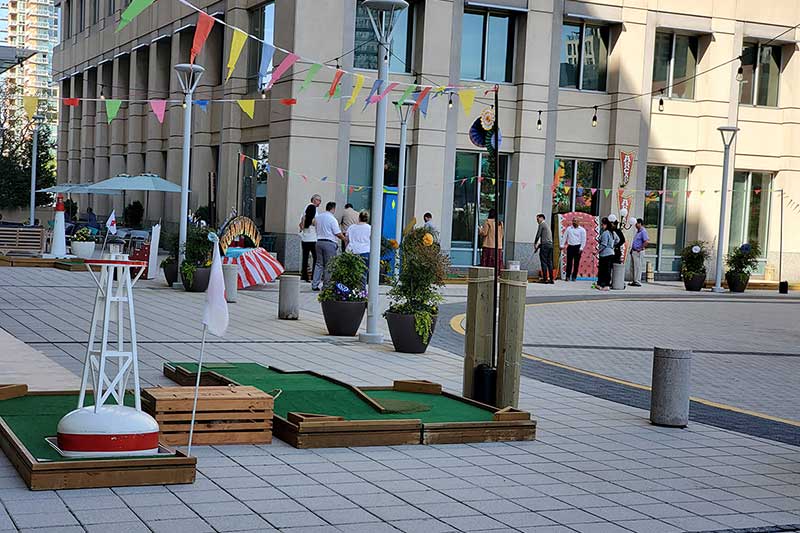 Westpark reached out to us themselves as they were interested in our capabilities of creating a 9 hole mini golf course rental on their plaza area. They had reached out to other mini golf event companies and were unsatisfied with their search to date as they felt what they were looking for was not going to be achieved. We informed them that we could recreate what they were seeking and provided them with initial information about our versatile mini golf experiences. It was agreed upon that a site inspection would be beneficial and one was scheduled.