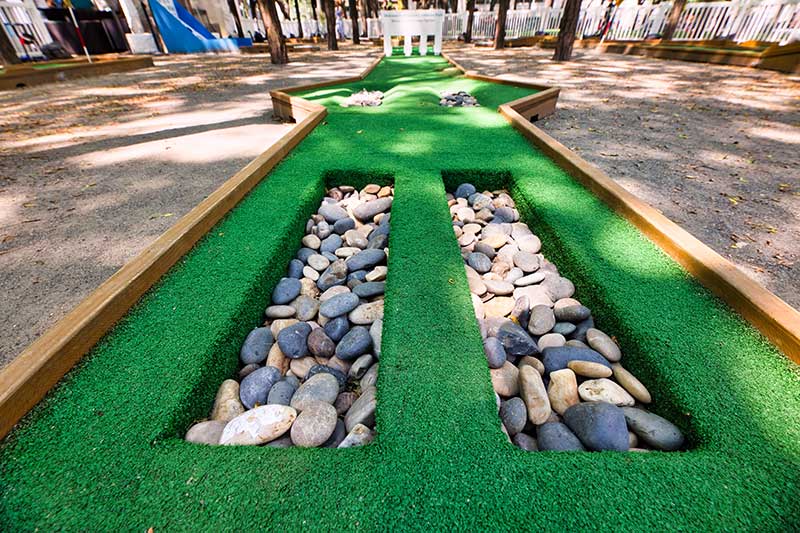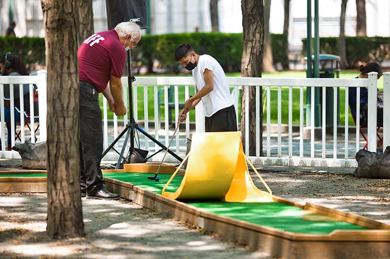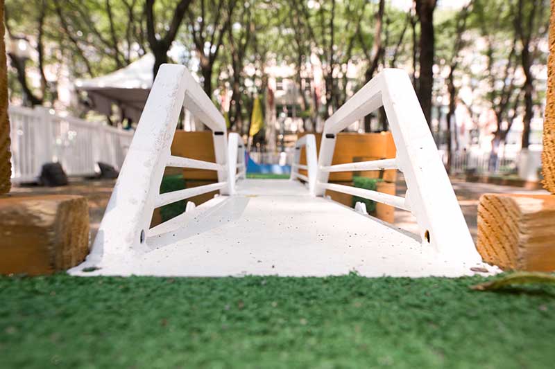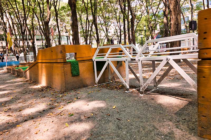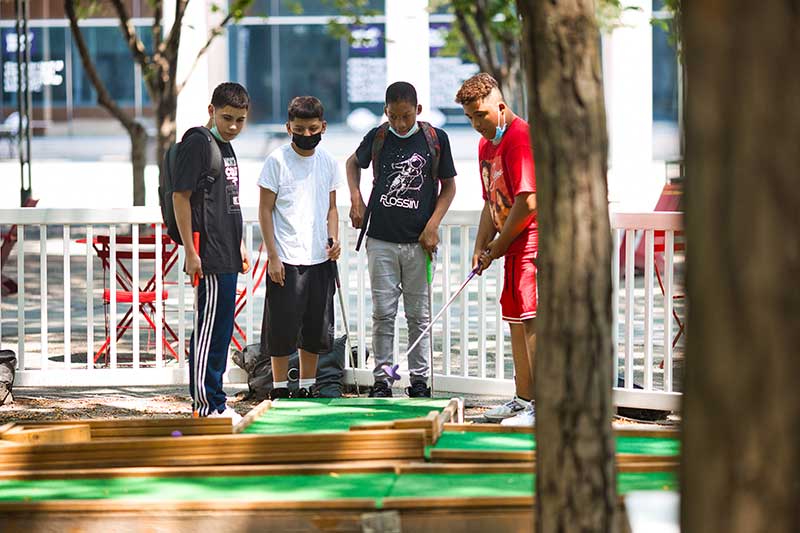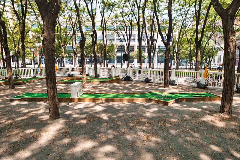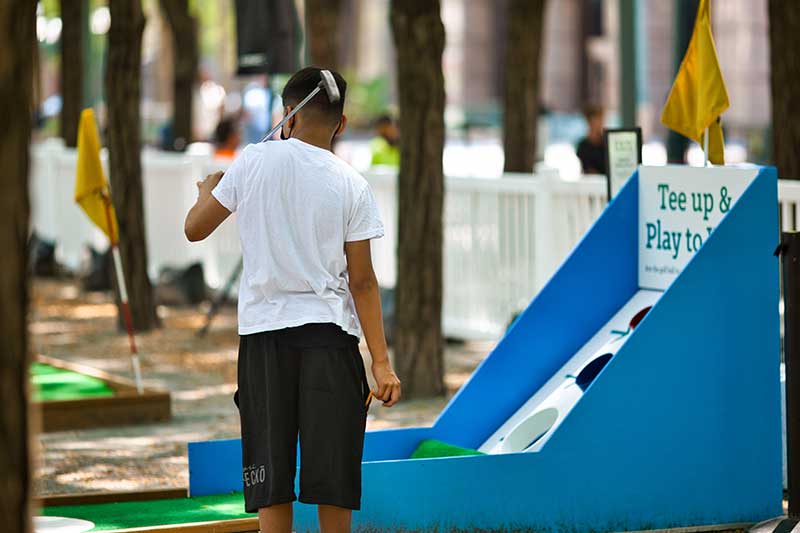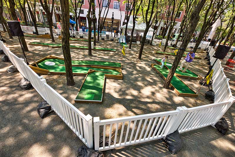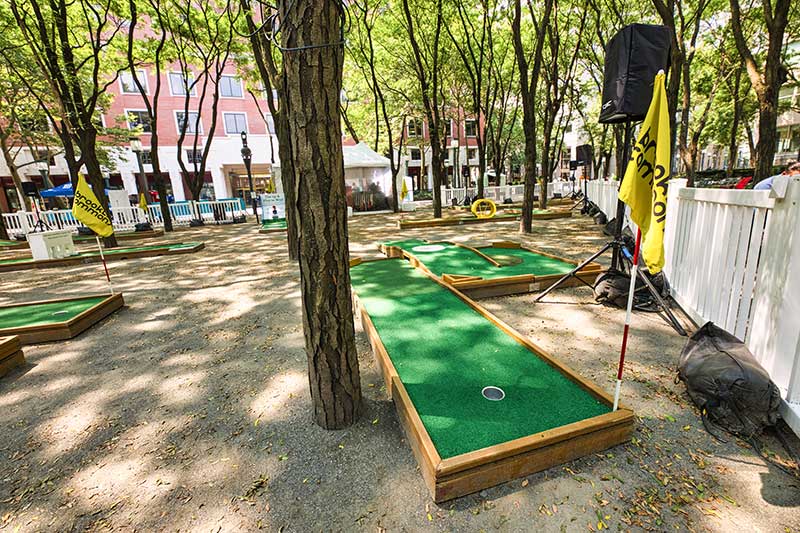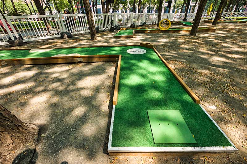 With the success of the long term mini golf installation at Brookfield Place, we were asked to create a 7 hole mini golf rental at Brookfield Properties location in Brooklyn, New York. Previously known as Metrotech, this 16 acre location is comprised of 12 office buildings centered around a common park/plaza area. Since its creation in the 1980's, the common park & outdoor plaza area has become a popular pass through area not just for the individuals working in the 12 office buildings but also for the residents in the nearby growing neighborhood.
