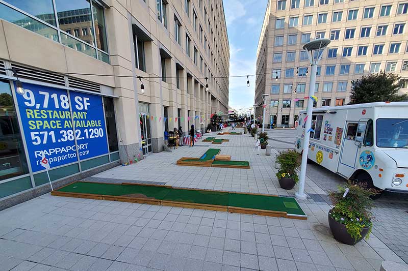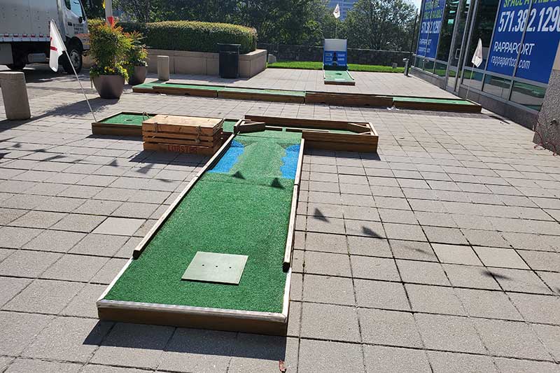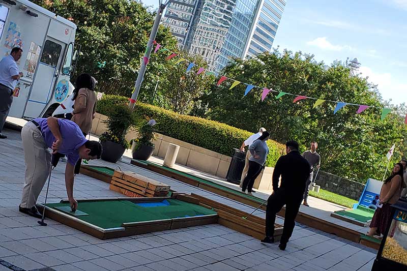 As late morning approached, individuals from their respective offices starting trickling down to the outdoor plaza area. Never before had such an attraction been available to them and they were extremely appreciative that it was being offered as an entertaining break from being in the office during a pandemic. With holes placed more than 6 feet apart as well as having our Mini Golf Sanitistation on site to sanitize the golf clubs and golf balls, mini golf players were comfortable and confident with the health and safety protocols that were in place. The course remained busy & crowded during the lunch hours and had fewer players between the hours of 2:00 PM-4:00 PM. It then had a final rush of activity between 4:15 to the course closing as employees were on the way home but choose to stay around to play a round of mini golf with their colleagues.